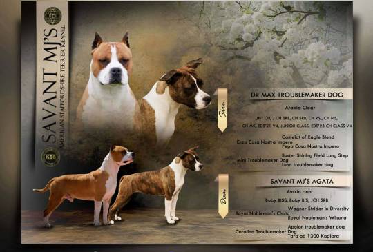 Odgajivačnica Savant MJ's Vam predstavlja naše novo leglo "D" Američkog Stafordskog Terijera, vrhunskog internacionalnog porekla! Naši štenci su odlično socijalizovani, veseli i spremni da postanu članovi vaše porodice. Izložbenog potencijala!