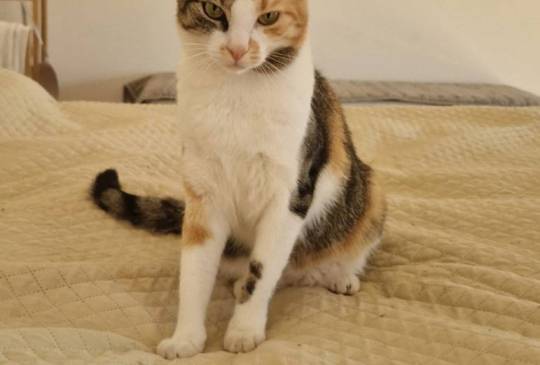 Godinu i po dana stara trobojna domaća mačka, razigrana, umiljata, odaziva se na svoje ime, naučena na život u stanu, ima sve higijenske navike.