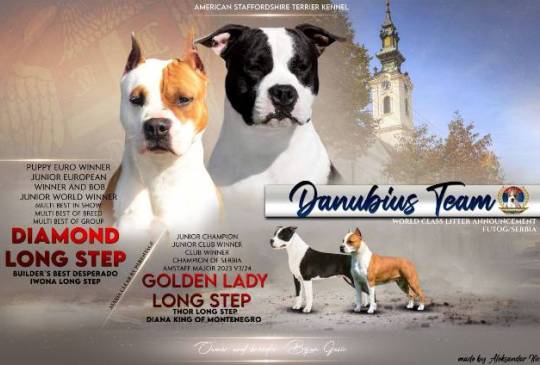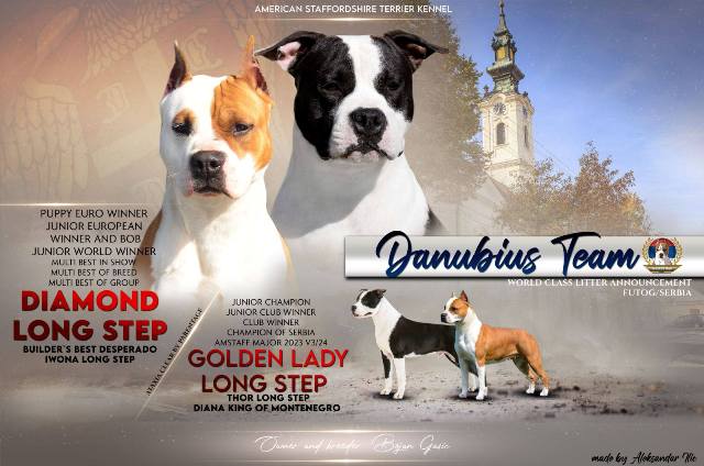 Odgajivačnica Danubius Team predstavlja vrhunsko leglo AST-a. U ponudi imamo 3 mužjaka i jednu ženku. Primili prvu vakcinu, više puta očišćeni od parazita. Otac štenaca mladi evropski i mladi svetski šampion Diamond Long Step. Uz štence ide rodovnik, veterinarski karton i radna knjižica. Štenci su oštenjeni 17.12.2025. U slikama i slika oba roditelja sa svim informacijama o njima i titulama.