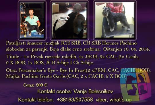 Patuljasti šnaucer mužjak JCH SRB, CH SRB Hermes Pachino slobodan za parenje. Boja dlake crno srebrna. Oštenjen 10. 04. 2014.